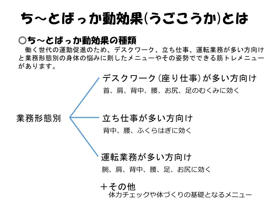 今まで、「ち~とばっか動効果」のメニューは10種類でしたが、この度38種類に増えました!どれも仕事や家事の合間にできる簡単なメニューなので、ぜひ、皆さんの目につきやすいところに掲示するなど活用してください!