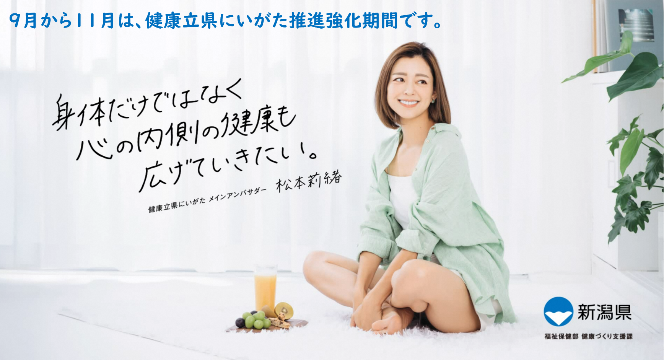 注目情報 健康立県 ヘルスプロモーションプロジェクト 健康経営の推進 糖尿病・慢性腎臓病(CKD)対策 からだがよろこぶデリ 健康立県にいがた 公式X(旧Twitter) 歯科疾患実態調査 目的別で探す 食生活 運動習慣 こころの健康 生活習慣病 たばこ アルコール がん 歯と口の健康 新着情報から探す 新着情報の一覧を見る RSS 現在、新着情報はございません。 よく見られるページから探す キーワードで探す 検索上位キーワード がん検診 禁煙支援 健康セルフチェック 生活習慣病の早期発見、重症化予防のための日常的に自分で行える健康チェックを紹介しています。 セルフチェックしてみる