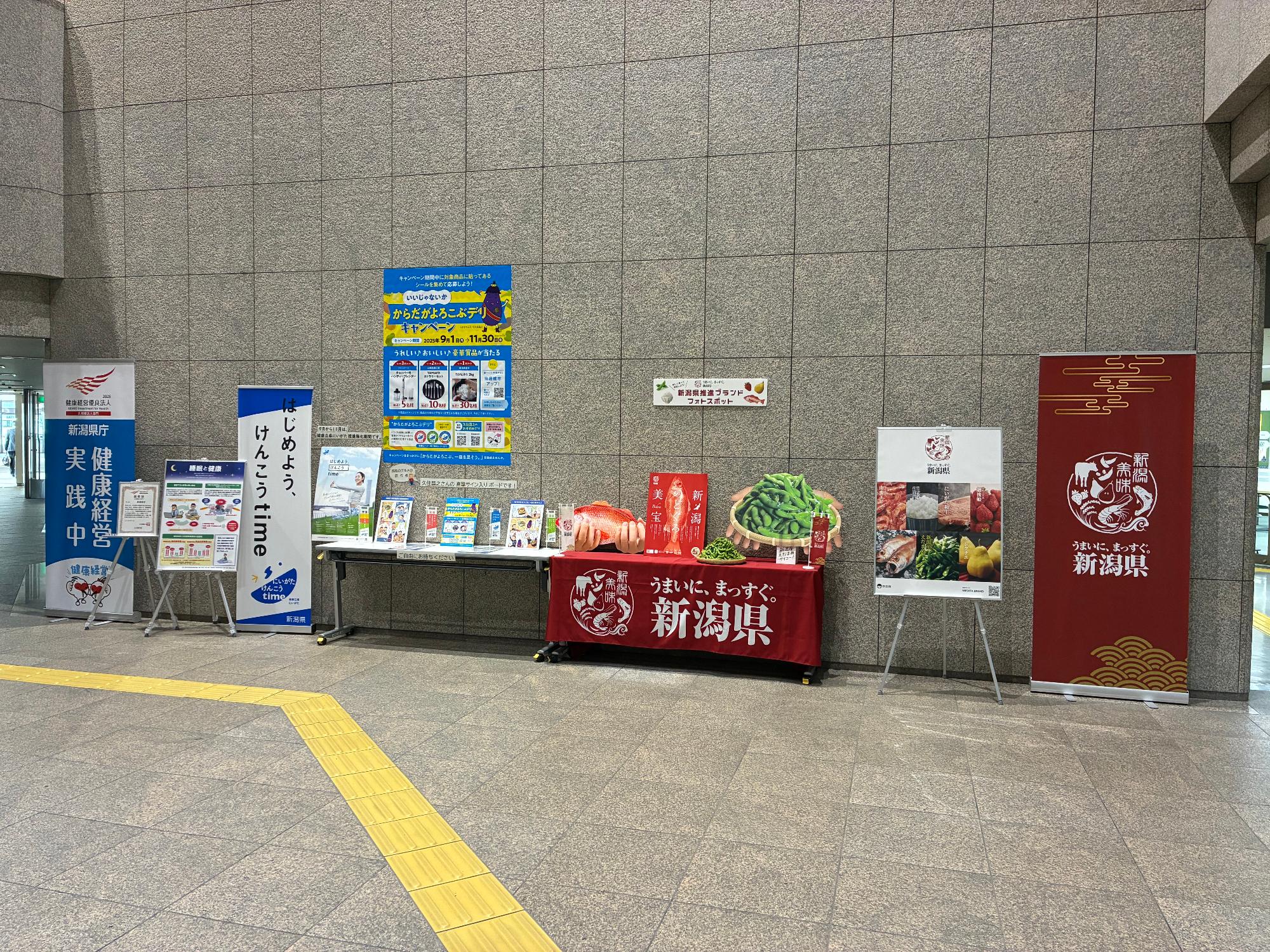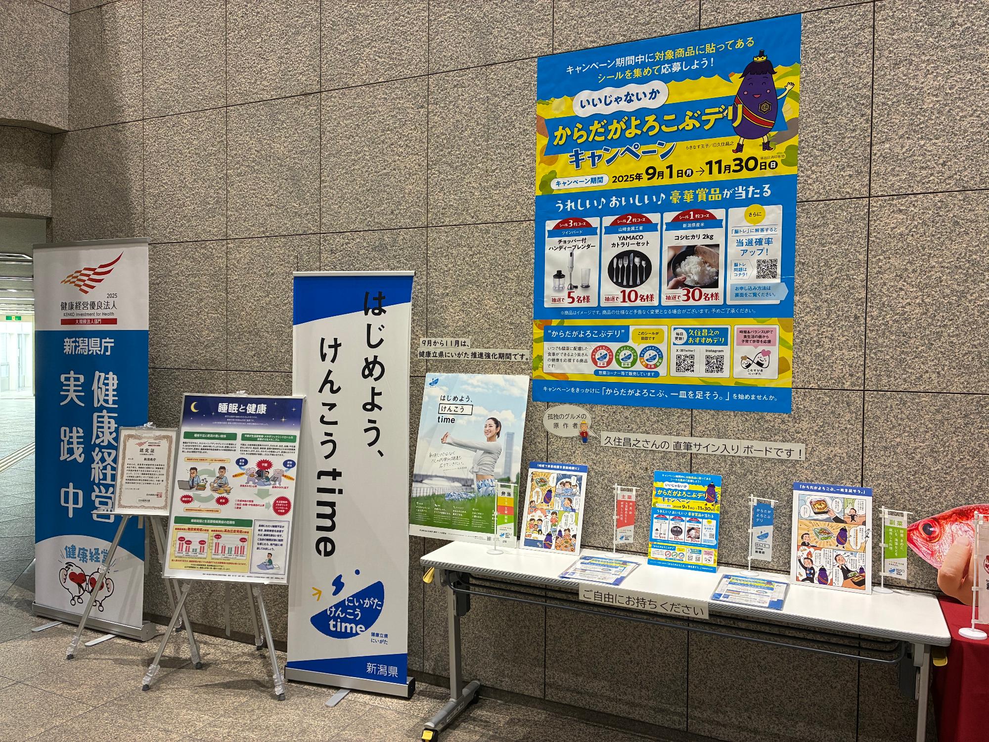 県庁玄関ホールで、からだがよろこぶデリキャンンペーンや健康立県にいがた等のPR展示を実施中!
