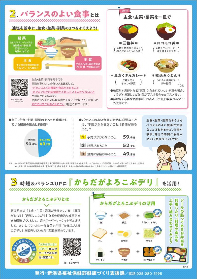 新潟県では、主食・主菜・副菜をそろえた食事をする人の割合が少ないことから、食生活のキャッチフレーズを「からだがよろこぶ、一皿を足そう。」とし、取組を推進しています。