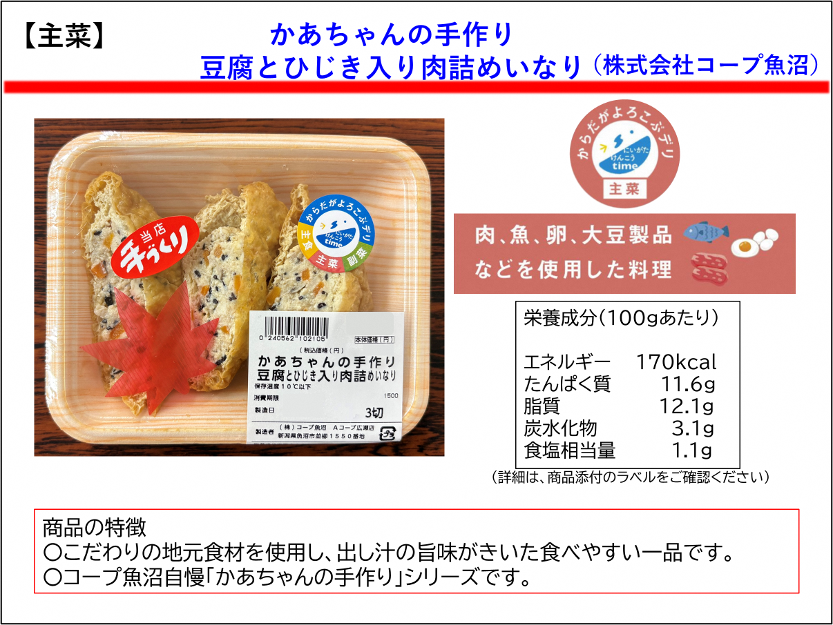 かあちゃんの手作り豆腐とひじき入り肉詰めいなり(株式会社コープ魚沼) (PDFファイル: 486.4KB)
