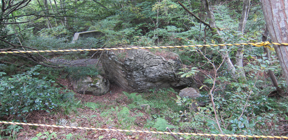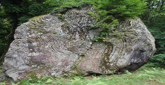 高さ・幅が5mを超える巨岩で、新潟県で最大の「夏井の大波石」です。2億年前、この場所が海だった頃に海底のプランクトンや泥が交互に層をなし、地殻変動によって作られました。