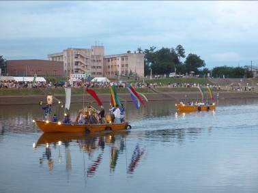 階段護岸でゆっくり川を見ながら休憩できる。7月には御輿川下りなども見られる。